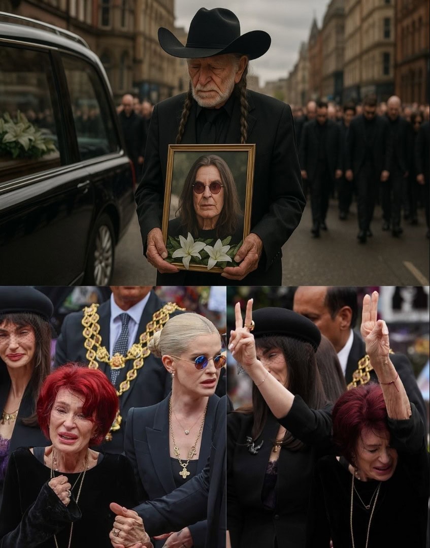 At 92, Willie Nelson walked slowly alongside the hearse, every step deliberate, every breath heavy with loss. Dressed in a black suit and his signature Stetson, he clutched a framed photo of his beloved friend — Ozzy Osbourne, the pride and soul of this very city. This image captures more than just a moment of mourning; it reflects a lifetime of friendship, resilience, and the profound weight of saying goodbye.